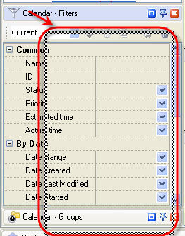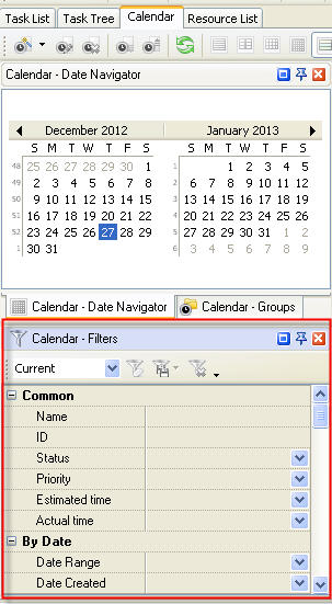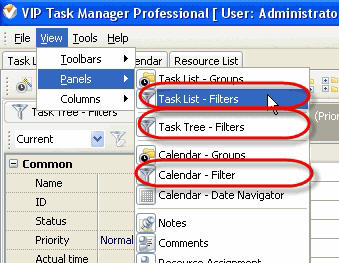 To display or hide Filters panel use main menu commands [View -> Panels -> Task List - Filters], [View -> Panels -> Task Tree - Filters] and [View -> Panels -> Calendar - Filters] .