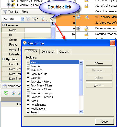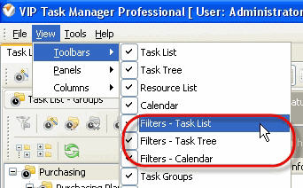 To display or hide Filters Toolbar use main menu commands [View -> Toolbars -> Filters-Task List], [View -> Toolbars -> Filters-Task Tree] and [View -> Toolbars -> Filters-Calendar].