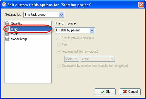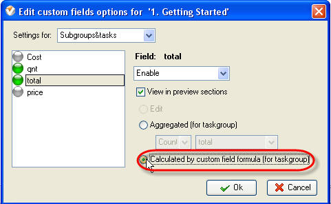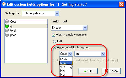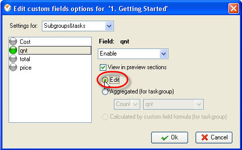 If this custom field may be entered by user, check “Edit” option. For task group it may be calculated per other tasks" custom fields that are enabled for this particular task group. For the latter case check “Aggregated (for task group)” option and select one of the arithmetic operations and required custom field from corresponding drop-down lists.