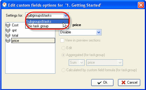 Select “Subgroups&Subtasks” from “Setting for” drop-down list to relate highlighted custom field to all tasks and task groups of current task group. If you select “This task group”, highlighted custom field will be related to current task group and won"t be related to its subgroups and tasks.