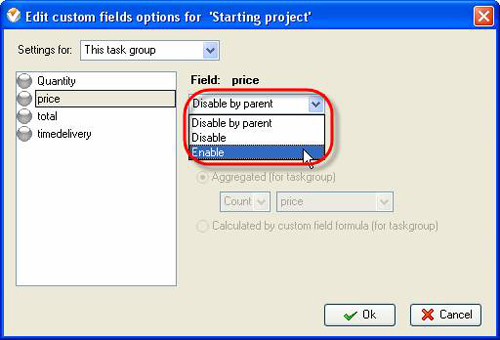 Select “Enable” from drop-down list to activate highlighted custom field, “Disable” " to make it invisible for current task group or make it the same as for parent task group by selecting “Disable by parent”/”Enabled by parent”. If the custom field is enabled, it has green circle, otherwise this circle is grey.