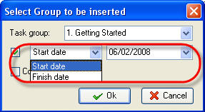 Check “Start date” option, select “Start date” or “Finish date” from drop-down list and select required date from corresponding drop-down box. For example, you select “Start date” and some task of duplicated task group has 01/10/2007 Start Date, 03/10/2007 Finish Date and 04/10/2007 Due Date. When you select new start date, e.g. 03/10/2007 , task finish and due dates will be postponed for the difference between new and old start dates. In our example new finish date is 05/10/2007 and new due date is 06/10/2007 . The same situation is with all tasks of duplicated task group.