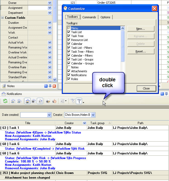 Double click on the space near Notifications panel's toolbar allows managing toolbars, commands and program options via Customize window