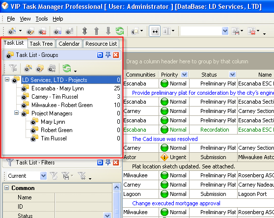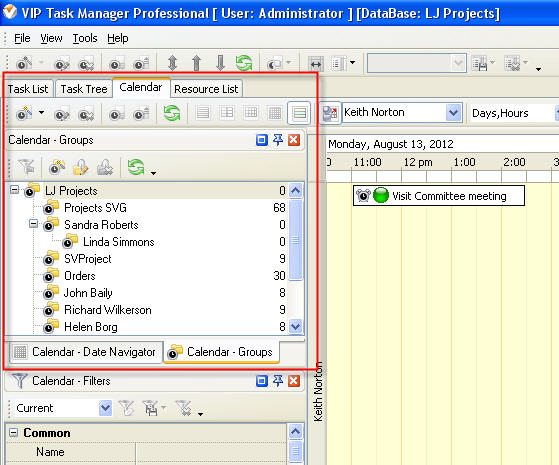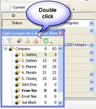 By default Task Groups panel is located in the left part of the Task List view under Task List Toolbar and in the left part of Calendar view.