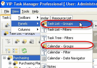 To display or hide Task Groups panel use main menu commands [View -> Panels -> Task List - Groups] and [View -> Panels -> Calendar - Groups]