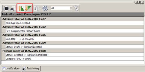 - To sort records ascending and descending by date use special icons on Task history toolbar