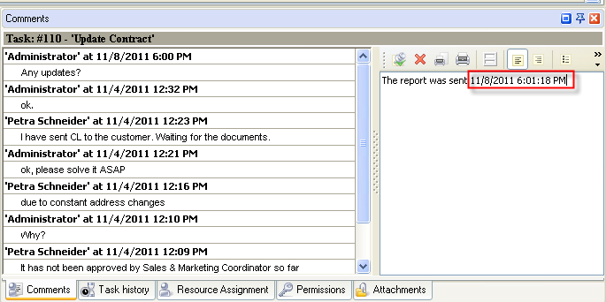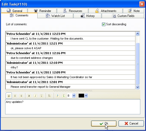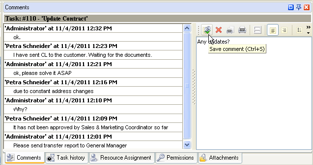 Open " New Task" or " Edit Task" dialog and select "Comments" tab or go to Comments panel