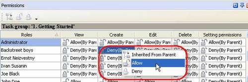Change the permission to view, create, edit, delete or set permissions opposite required resource or role by using Permissions toolbar or right clicking on this cell