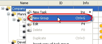 Right click on Task Tree grid and select 'New Group' from drop-down list
