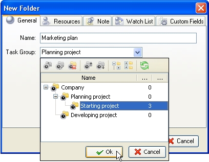 In 'New Folder' dialog on "General" tab enter task group name into "Name" entry field. Open 'Task Group' drop-down box, select required parent task group from task group tree and click 'Ok'.