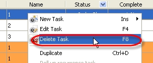 Right click on required task on Task List, Calendar or Task Tree grid and select "Delete Task" or "Delete" correspondingly from drop-down list