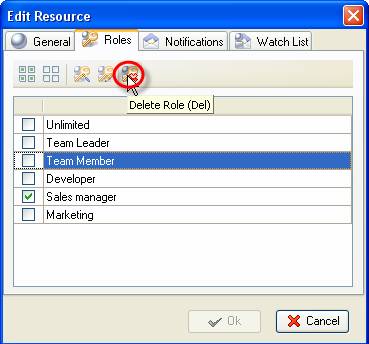- In "New Resource" or "Edit Resource" dialog select Roles tab, select required role and click on "Delete Role" button or press " Del " key