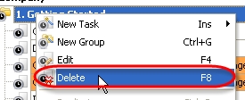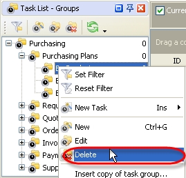 - Right click on selected task group on Task Tree grid and select "Delete" from drop-down list
