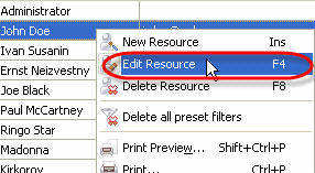 Right click on required resource on Resource List grid and select "Edit Resource" from drop-down list