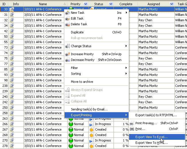 Right click on Task List, Task Tree or Calendar grid and select " Export View To Excel: " or " Export View To HTML: " from drop-down list , enter export file name and path in "Export File Name" dialog.