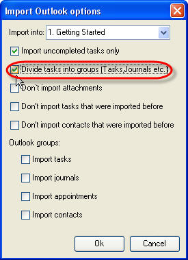 Check ‘Divide tasks into groups (Tasks,Jornals etc.)’ option to import the tasks, journals, appointments, etc into corresponding task groups in the same form as they are in Outlook.