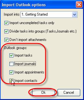 Check the data groups from ‘Outlook groups:’ section to import from Outlook (tasks, journals, appointments, contacts) and click ‘Ok’ button