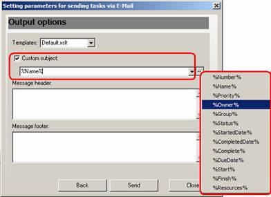 - You can add custom subject to email message. Click button “…” and select subject from the list, or combine several subjects