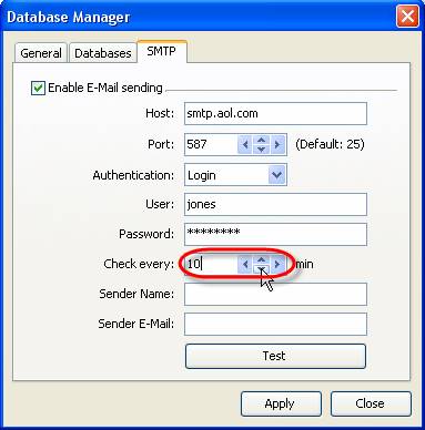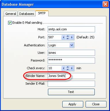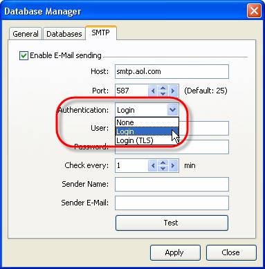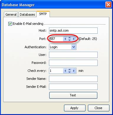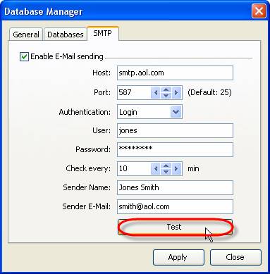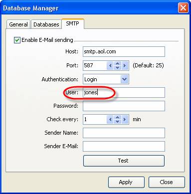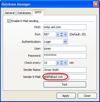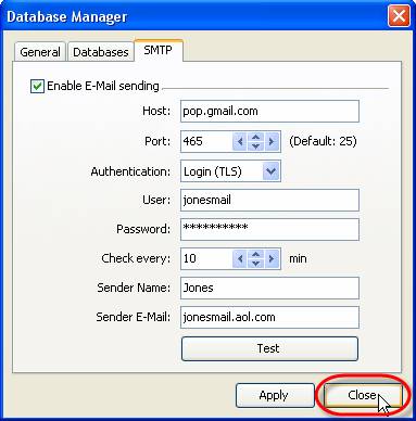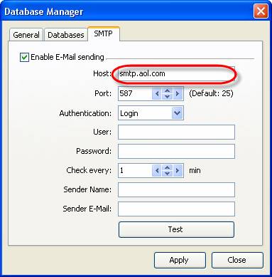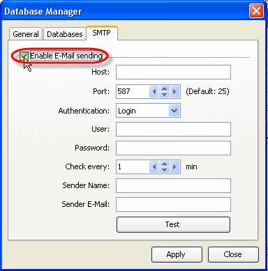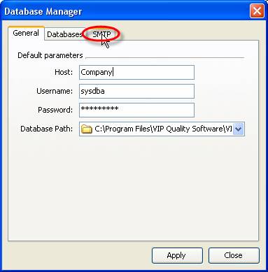 - Select ‘SMTP’ tab in Database Manager’ window