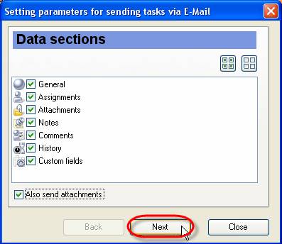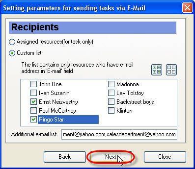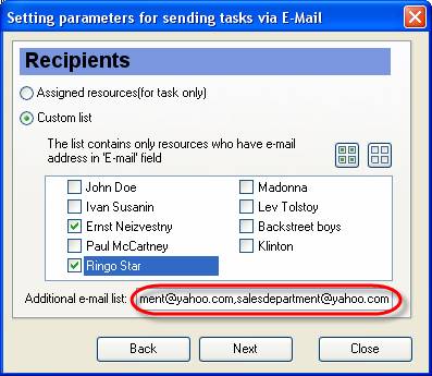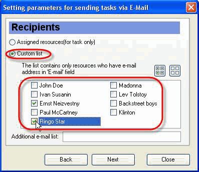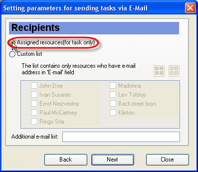 Set ‘Assigned resources’ radio button to send selected task to the resources assigned to this task. The list contains only resources who have e-mail address in 'E-mail' field.