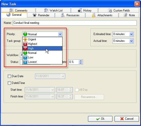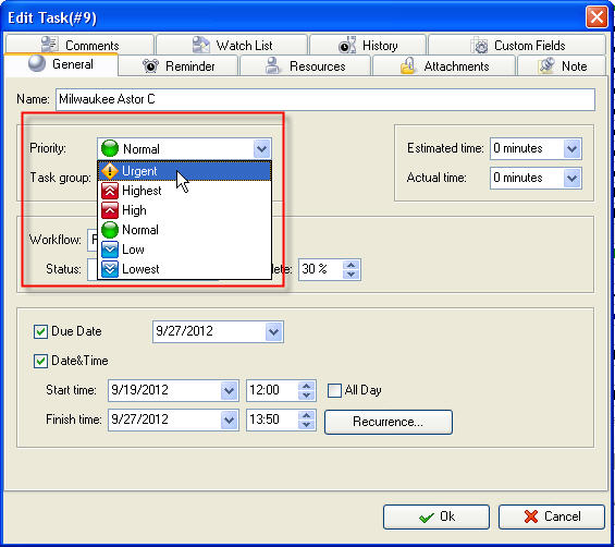 - Open "Edit Task" dialog and select required priority from "Priority" drop-down list
