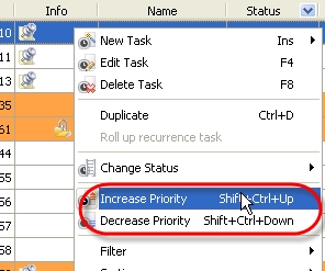 Right click on required task on Task List, Task Tree or Calendar grid and select "Decrease Priority" / "Increase Priority" from drop-down list