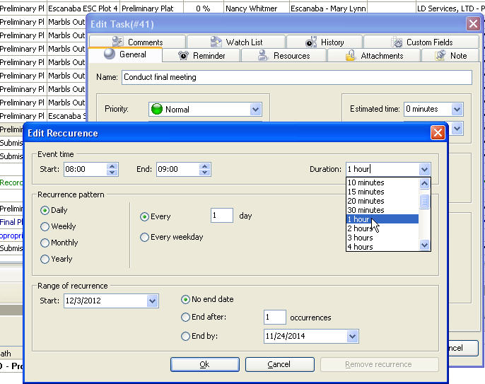 In "Edit Recurrence" dialog use up-down buttons or keyboard to set task start and finish time or select required task accomplishing duration from "Duration" drop-down list