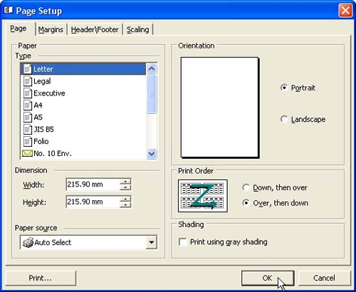 In "Page Setup" dialog on "Page" tab select required paper style, dimension, orientation, page source, print order and check corresponding option if you want to print using grey shading. Click on "Print" button if you are ready to print.