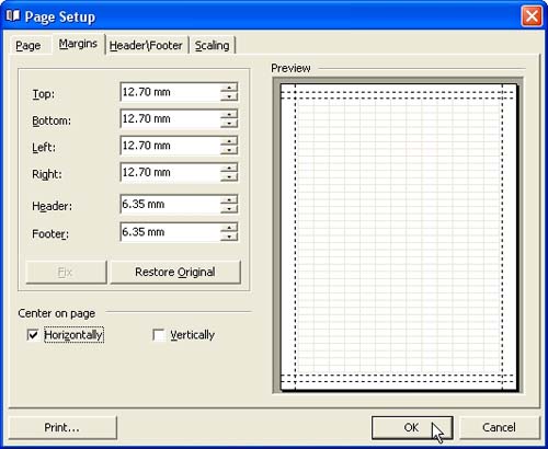 In "Page Setup" dialog on "Margins" tab enter required margins' values, check corresponding option to centre margins horizontally or vertically on page. To return to margins default values click on "Restore Original" button. Click on "Print" button if you are ready to print.