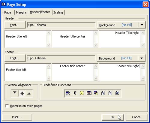 In "Page Setup" dialog on "Header/Footer" tab enter left, centre and right header and footer titles or select predefined information from "Predefined Functions" box, set headers' and footers' font, background, vertical alignment. Click on "Print" button if you are ready to print.