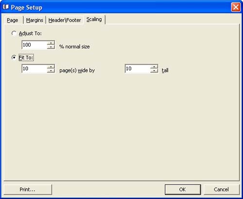 In "Page Setup" dialog on "Scalign" tab enter percentage page scale of normal size by checking "Adjust To" radio button and selecting required value in corresponding entry field with the help of up-down buttons. To divide your task list into required amount of pages lengthways and in width check "Fit To" radio button and enter required values in corresponding entry fields using up-down buttons. Click on "Print" button if you are ready to print