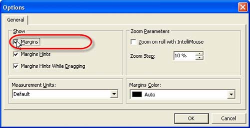 If you don't need margins on your page, go to main menu command [File -> Options:] and uncheck "Margins" checkbox or use [View -> Margins] main menu command.