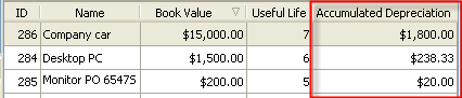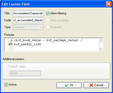 custom field “Accumulated Depreciation” with the formula: