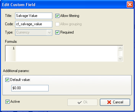 custom field “Salvage Value” with code “cf_salvage_life”