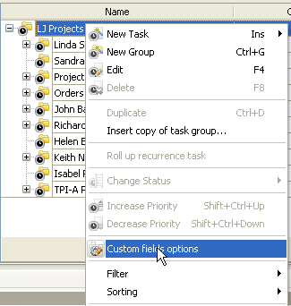 • To enable the displaying of the average deviation of planned budget for task groups select the root task group and click "Custom fields options"