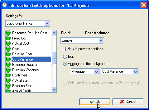 • select "Average" and the custom field name "Cost Variance"
