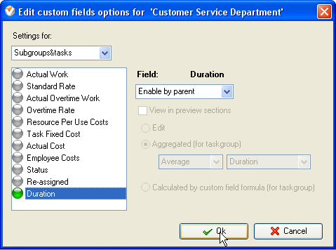 custom field "Duration" and select the option "Enable by parent".