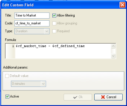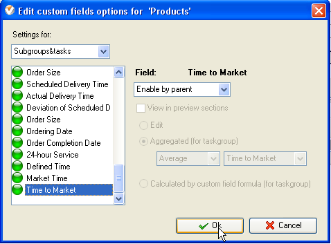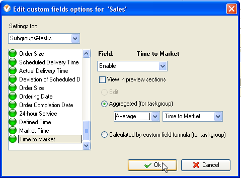 - To enable the displaying of the average time to market of products or services select custom field "Time to Market”, do the following: