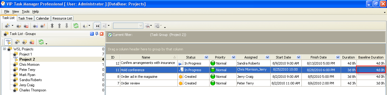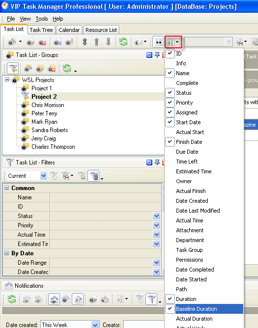 5. to display the value of custom field Baseline Duration on Task List or Task Tree please go to Task List or Task Tree, click Task List Columns or Task Tree Columns button and check the custom field "Baseline Duration"