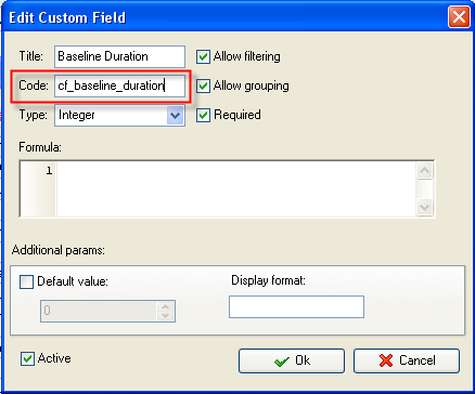 3. in "Code" field enter "cf_baseline_duration"