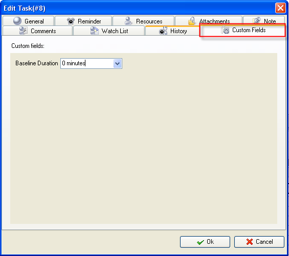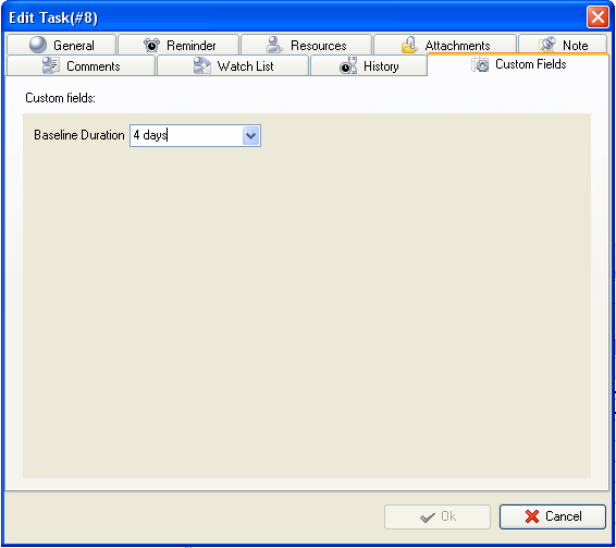 - Enter the value for Baseline Duration custom field. For example, if the planned duration of a task is 4 days select "4 days" from drop-down list.