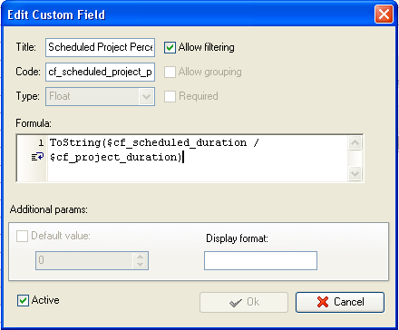 - Create custom field "Scheduled Project Percentage" with code "cf_scheduled_project_percentage" and the following formula: