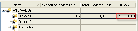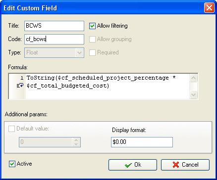 - Create the custom field "BCWS" (Budgeted Cost of Work Scheduled) with the formula: