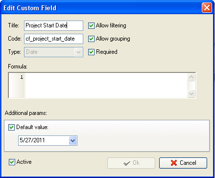 - Create custom field "Project Start Date" with code "cf_project_start_date"