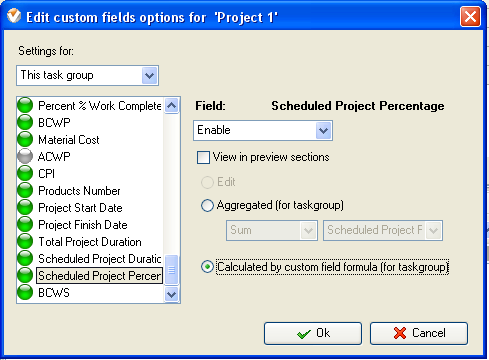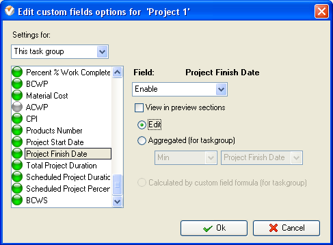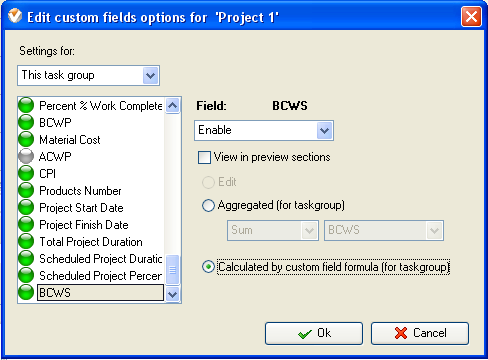 - On Task Tree select the task group with project tasks for which you need to display Budgeted Cost of Work Scheduled (BCWS) and select "Custom fields options"