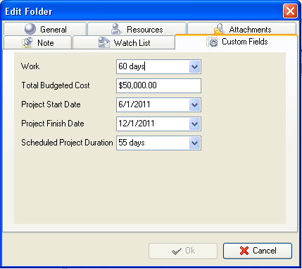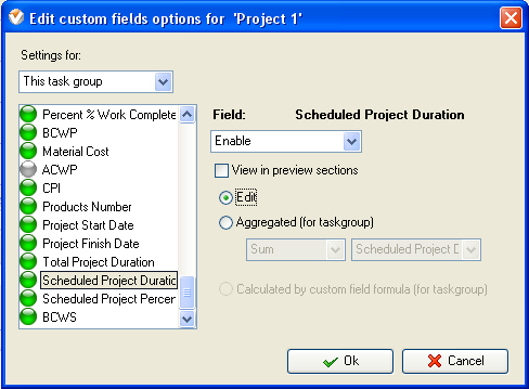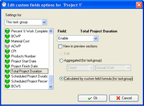 - Set the following custom fields settings for the following custom fields: "Total Project Duration", "Total Budgeted Cost" (or "Actual Cost"), "Scheduled Project Percentage" and "BCWP":