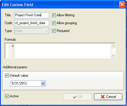 - Create custom field "Project Finish Date" with code "cf_project_finish_date"