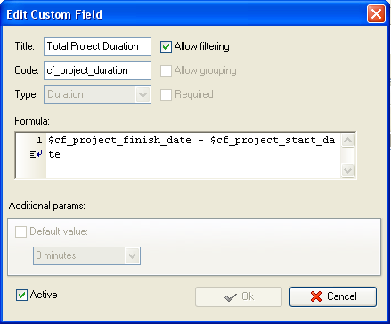 - Create custom field "Total Project Duration" with code "cf_project_duration" and the following formula:
