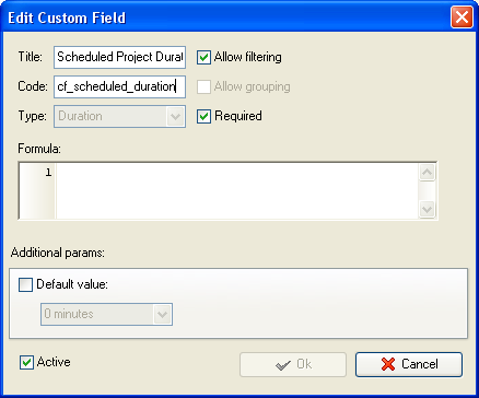 - Create custom field "Schedule Project Duration" with code "cf_scheduled_duration"