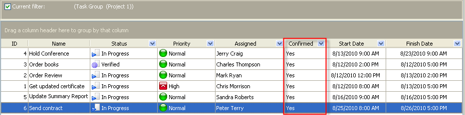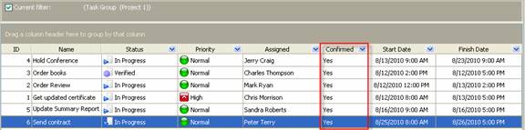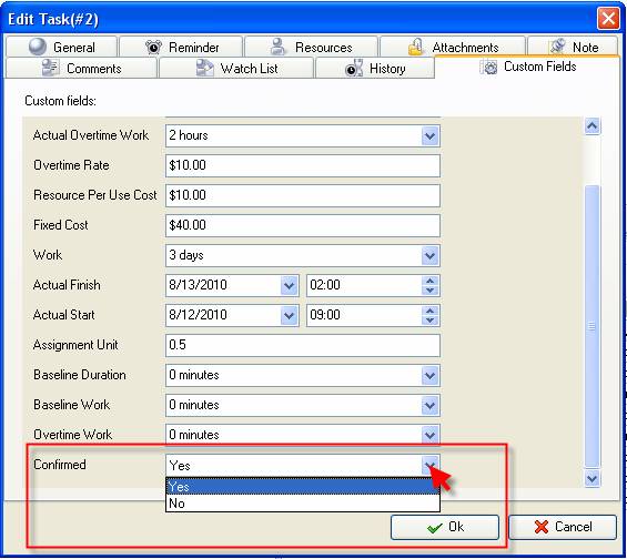 Confirmed custom field shows if the assigned resource accepted or rejected the assigned task. This custom field has 2 values: Yes or No.